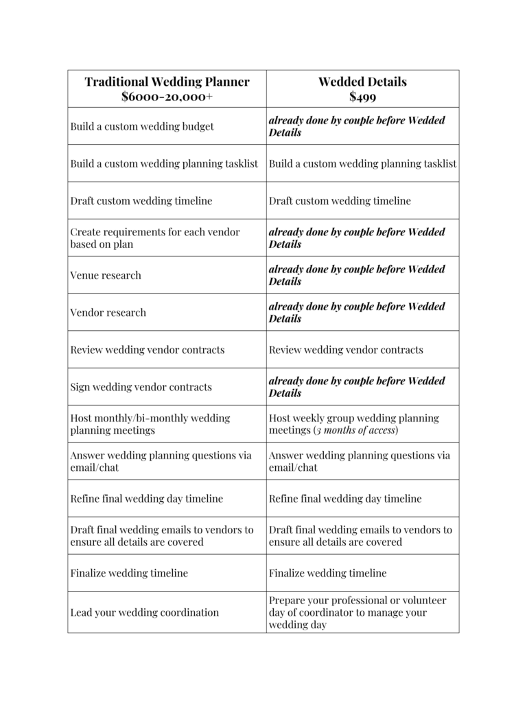 - Weekly wedding planning calls with a planner with over a decade of experience