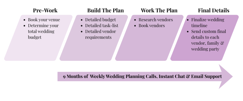- Weekly wedding planning calls with a planner with over a decade of experience